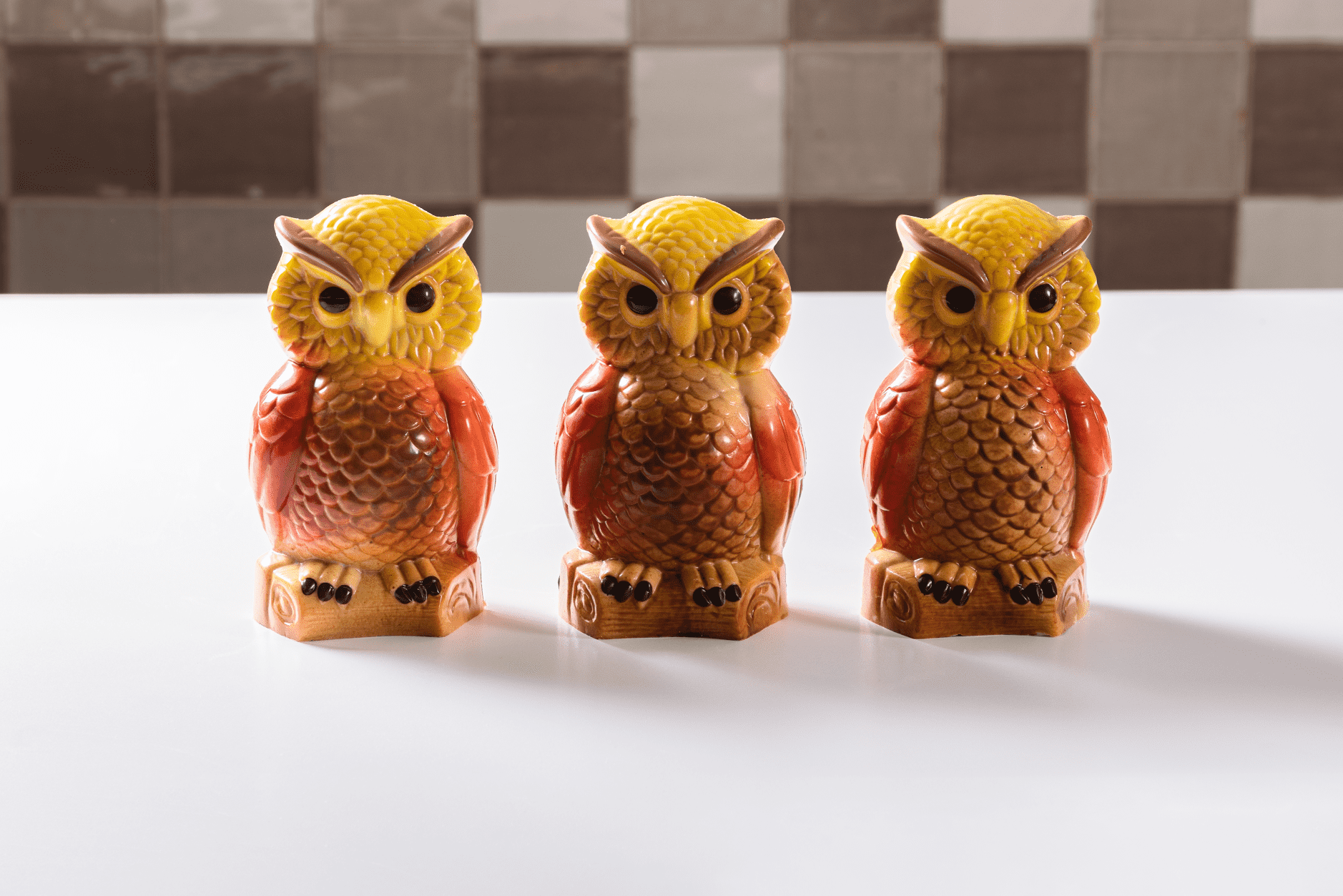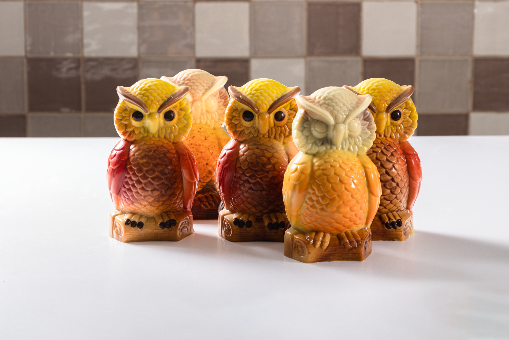 Chocolade holfiguur : ingekleurde uilen witte chocolade/melkchocolade
